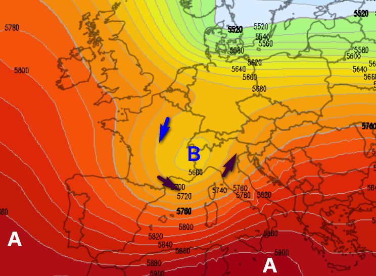 Si nota il vortice che sfonda sul nord-ovest e le correnti di Libeccio sull’Italia. Il transito di questo fronte perturbato sarà preceduto da un temporaneo aumento delle temperature al sud, dovuto all’afflusso di aria calda, con punte anche superiori ai 35°C. I fenomeni si spingeranno al massimo sin sul Lazio e la Campania, ma qui avranno carattere sparso e solo occasionalmente i fenomeni potrebbero assumere carattere di forte intensità. Qualche temporale potrà sfondare sulle Marche, più difficilmente sull’Abruzzo, protetto dalla catena appenninica rispetto alla circolazione di Libeccio.