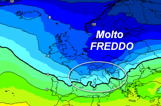 Questa invece è la mappa delle temperature a 1500 metri attese in Europa nella medesima giornata, ovvero mercoledi 8 gennaio: