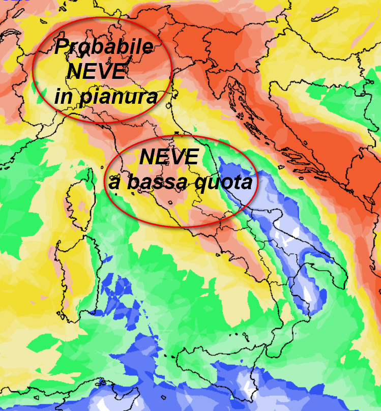 Combinando le due mappe si nota la possibilità più che concreta di nevicate a bassissima quota al nord, con possibili nevicate (bagnate o miste a pioggia) anche su alcune zone della Pianura Padana, a fronte di isoterme a 1500 metri comprese tra -2 e -4° e la presenza di precipitazioni anche importanti. Inoltre, anche le regioni centrali potrebbero vedere cadute di neve a quote basse (ma quasi sicuramente non in pianura) a fronte di isoterme alla medesima quota comprese tra 0 e -1, mentre sul resto d’Italia la quota neve sarà più elevata.