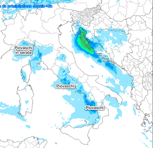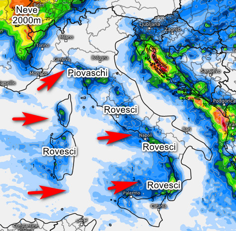 Neve tra Val d’Aosta e Ossola oltre i 2000 metri. Rovesci lungo tutto il versante tirrenico, le aree interne, la Sardegna occidentale e il nord della Sicilia. In ombra pluviometrica tutte le altre regioni con fenomeni assenti. Clima molto mite, venti sostenuti da ovest e mareggiate lungo le coste del Tirreno.
