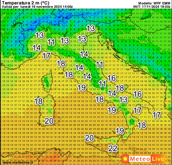 Clima molto mite su tutta l’Italia. Punte di 20-22° sulle due Isole Maggiori e 18-19° sul Tirreno.