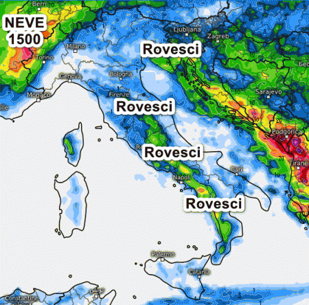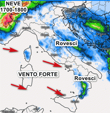Neve sui settori di confine della Val d’Aosta e Ossola anche a carattere di bufera sopra i 1400-1500 metri. Rovesci nelle aree interne del centro-sud, sulla Campania e la Calabria Tirrenica. Sul resto d’Italia tempo variabile, ma asciutto.