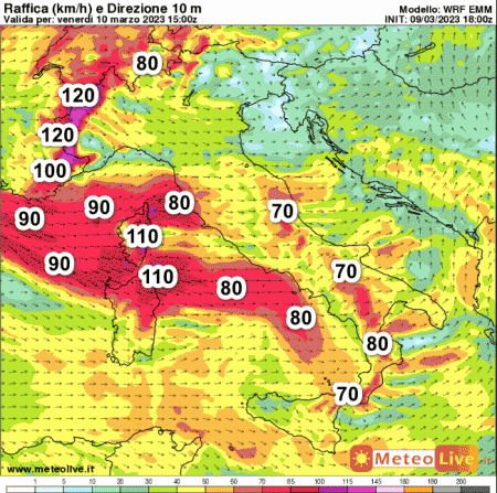 Punte di 120km/h in prossimità delle Alpi occidentali; 110km/h tra la Corsica e la Sardegna, con mare in pessime condizioni. Tra i 70 ed i 90km/h sul resto del Tirreno e lungo la dorsale appenninica centro-meridionale, oltre allo Stretto di Messina.