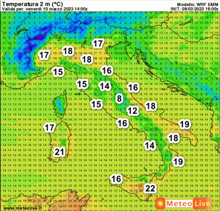Ancora neve a carattere di bufera sui settori di confine della Val d’Aosta ed Ossola, ma con quota neve in rialzo fino a 1700-1800 metri. Qualche rovescio di passaggio tra le Marche, l’Umbria, l’Abruzzo e la Calabria Tirrenica. Ancora vento forte da nord-ovest sul Tirreno, Corsica, Sardegna e Sicilia con mari in cattive condizioni, per il resto tempo buono. Clima sempre molto mite per il periodo.
