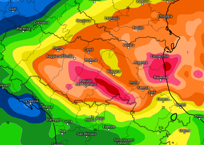 Il maltempo dovrebbe così interessare gran parte della Penisola ma con le ultime emissioni ci sono alcune aree che potrebbero assistere a precipitazioni più intense e localmente preoccupanti, ecco quelle previste dal modello ECMWF per l’Emilia Romagna, proprio per giovedì 14 novembre, notate in rosso scuro gli accumuli superiori agli 80-90mm, tra Comacchio, Ravenna ed Appennino: