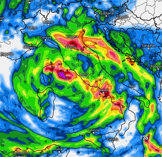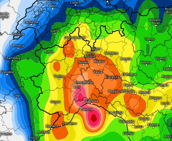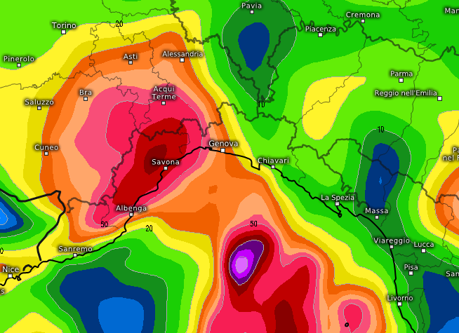 Le temperature piuttosto basse in quota (tra 0 e 1°C a 1500m) potrebbero attenuare il carico precipitativo sulle vallate, giacché sotto i 1200-1300m si presenterebbero sottoforma di neve, ma solo sul versante padano dell’Appennino ligure, mentre sulla costa e nell’immediato entroterra il rischio di smottamenti e allagamenti resterebbe elevato qualora queste mappe venissro confermate.