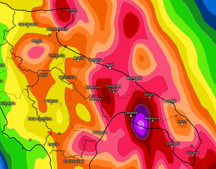 Ecco una mappa che mostra gli accumuli importanti sulla regione, specie tra Taranto e Manduria, anche se in serata sarà il Barese la zona più colpita: