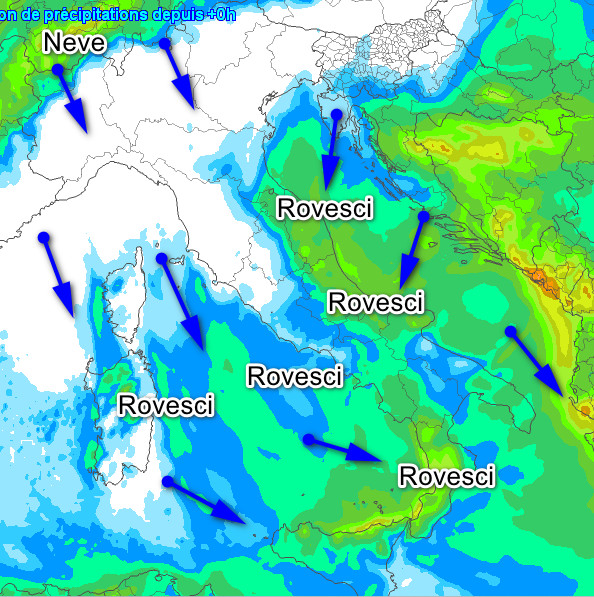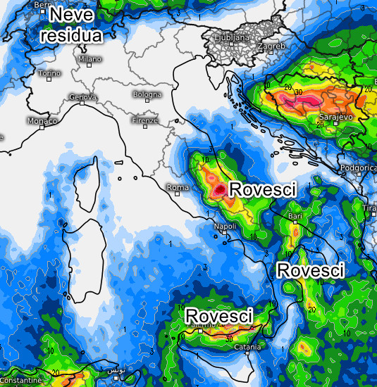 MALTEMPO sul medio-basso Adriatico e su gran parte del meridione con acquazzoni, temporali e NEVICATE in Appennino a quote anche basse. Al nord neve sui settori alpini di confine potenzialmente fino a 400-800m, per il resto soleggiato, limpido e a tratti ventoso, così come sulla Toscana e l’alto Tirreno. Venti di burrasca o tempesta tra nord e nord-ovest con i bacini centro-meridionali in cattive condizioni.