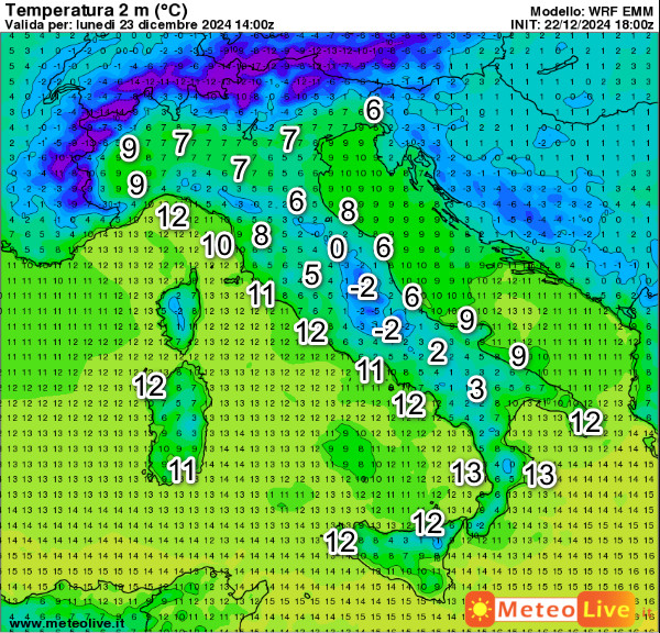 Sul fronte delle temperature, questi sono i valori attesi in Italia alle ore 15 di lunedi 23 dicembre: