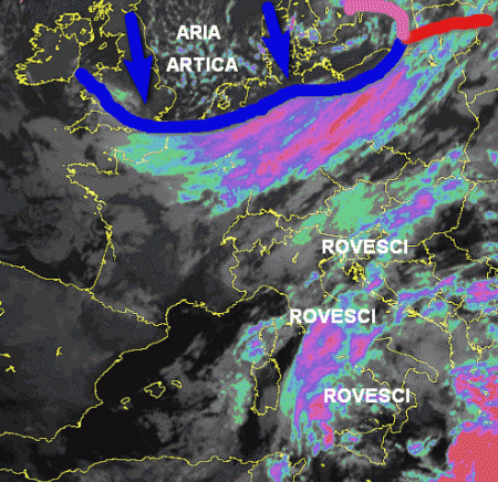 La seconda è ubicata molto più a nord, alle latitudini dell’Olanda e del Belgio; si tratta di un fronte freddo molto attivo seguito da aria fredda di matrice artica. Questo avrà un’azione di maglio ed in serata sarà già addossato all’arco alpino. L’aria fredda che è presente dietro al sistema frontale sarà la protagonista in Italia nelle giornate di domenica e lunedi, ma ne parleremo in separata sede.