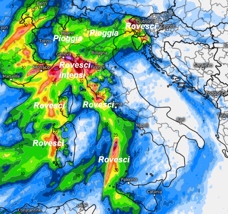 Segnaliamo la possibilità di rovesci intensi tra la Liguria centro-orientale e le coste toscane con la possibilità anche di temporali. I fenomeni saranno più frequenti al mattino, mentre nel pomeriggio si avrà un alleggerimento del carico precipitativo. Piogge sparse anche sul resto del settentrione ad eccezione del Piemonte e della Romagna; in giornata avremo una parziale attenuazione delle piogge anche su questi settori, con i fenomeni che diverranno maggiormente sporadici.