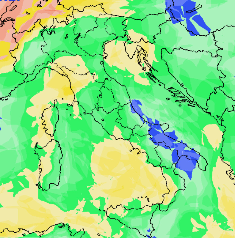 Sulle regioni settentrionali si notano isoterme alla medesima quota comprese tra 0 e -2° in sede alpina e sull’alta Pianura Padana: saranno queste le aree che potrebbero vedere i fiocchi di neve anche a quote basse; sul resto d’Italia avremo invece temperature più miti e neve solo in Appennino a quote medio-alte.