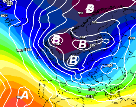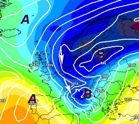 Ci sono anche versioni diverse dell’affondo, che rimane comunque ancora tutto da decifrare, anche se l’impeto delle correnti nord-occidentali sembrerebbe determinante nel limitare l’azione di questo possente vortice all’est europeo, qui sotto comunque un’emissione che coinvolgerebbe anche il settentrione: