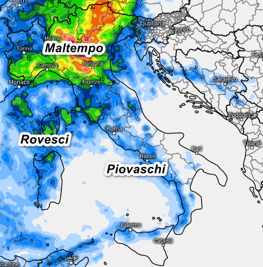 Maltempo su gran parte del settentrione con piogge e temporali. Quota neve attorno a 1000-1200 metri al mattino, in rialzo fino a 1400-1500 metri nel pomeriggio (Accumuli di PIOGGIA sino ad oltre 100mm su… – MeteoLive.it). Rovesci anche su Toscana, zone interne del centro e Sardegna, piovaschi anche sulla Campania, la Calabria Tirrenica e il nord della Sicilia specie in serata, altrove tempo asciutto. Temperature in sensibile calo.