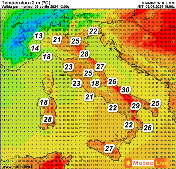 Punte di 30° saranno ancora possibili sulla Puglia, 29° sulla Lucania, 28°sulla Sardegna meridionale e sulla Romagna. Temperature invece in calo al nord-ovest con l’incedere delle precipitazioni.
