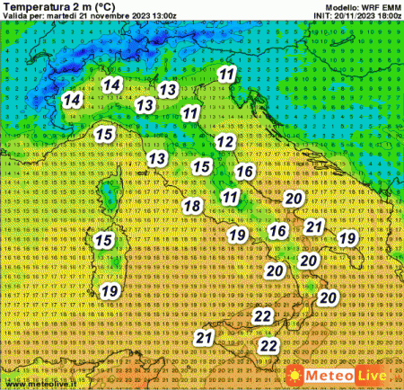 Punte di 22° sulla Sicilia e 20-21° al sud. Valori nettamente più freschi al nord, specie al nord-est con circa 11-13°.
