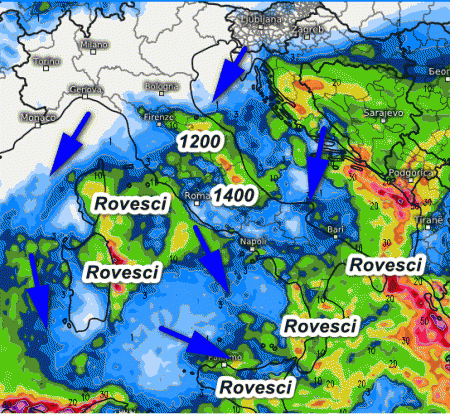Tempo instabile al centro e al meridione con rovesci specie lungo il versante adriatico sulla Sardegna orientale e all’estremo sud. Nevicate sull’Appennino centrale, ma solo oltre i 1200-1400 metri. Ventoso su tutta l’Italia e temperature in calo al centro e al sud.