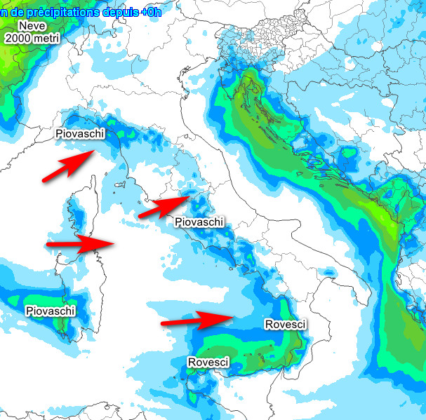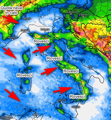 Rovesci ed anche qualche temporale sul versante tirrenico, zone interne, Sardegna occidentale e nord Sicilia. Attenzione ai venti forti ed ai mari in cattive condizioni con mareggiate sui lidi occidentali. Assenza di fenomeni sulle pianure del nord e su buona parte del versante adriatico, in ombra pluviometrica. Abbondanti nevicate tra Val d’Aosta, Ossola e rilievi più occidentali con quota neve in calo da 1800 metri della mattinata a 800-1000 metri in serata. Possibile vento di caduta dalle Alpi, molto mite, in Valpadana. Temperature sempre miti su tutte le regioni, in calo solo dalla sera al nord.