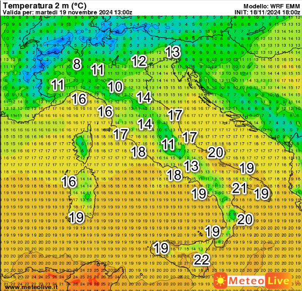 Tranne alcuni casi della Pianura Padana dove avremo valori anche sotto i 10°, sul resto d’Italia temperature molto miti. Punte di 22° sulla Sicilia e 20° su Calabria e Puglia.
