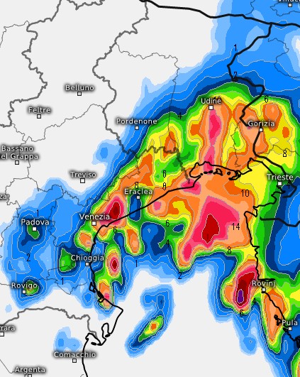 Forti temporali potranno infine investire le coste venete entro notte e risalire sulla pianura friulana e veneziana, come vediamo in questa mappa: