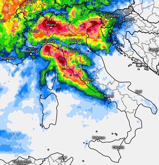 Le zone più esposte saranno il nord Italia e le regioni centrali tirreniche. In particolare, si prevedono forti temporali tra Lombardia occidentale, Liguria e Toscana, con fenomeni intensi su Savonese, Genovesato, Pavese, Milanese e Lago Maggiore.