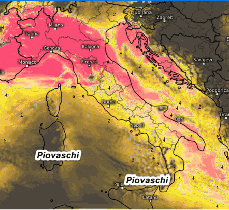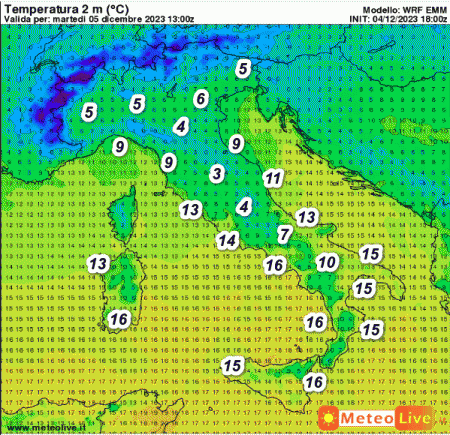 Ancora valori bassi al nord e nelle aree interne dell’Italia centrale. Più mite il clima al sud e sulle Isole con punte di 15-16°.