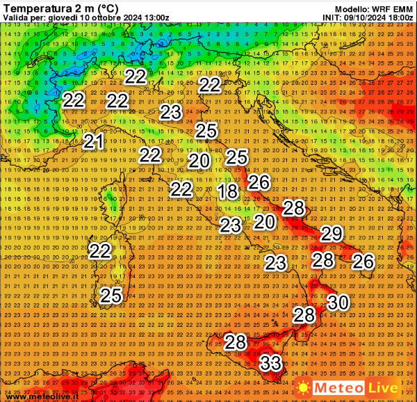 Estate che non vuole andarsene al sud con punte di 33° in Sicilia, 30° in Calabria e 28-29° in Puglia. Temperature in aumento anche al nord stante il graduale ritorno del sole nell’arco del pomeriggio.