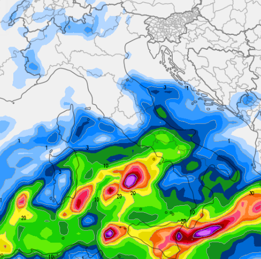 Un canale depressionario si aprirà sulle regioni centro-meridionali a causa dell’inserimento di aria più fresca in quota e dell’indebolimento dell’alta pressione, una flessione che però, almeno sino a lunedì 20, non avrà alcuna ripercussione al nord e su gran parte del centro, salvo una diminuzione delle temperature, mentre avrà effetti ben più rilevanti su Sardegna, Sicilia, Lazio e gran parte del meridione peninsulare con piogge, temporali e addirittura locali nubifragi, come mostra questa mappa prevista per mercoledì 15 ottobre: