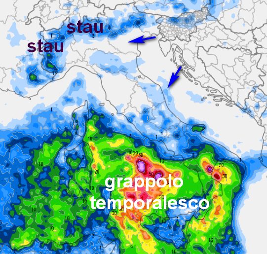 Si nota molto bene l’effetto dei venti da est al nord e sul medio Adriatico, che produrranno nuvolaglia e qualche locale piovasco a ridosso dei rilievi alpini e prealpini, ma anche appenninici per effetto “stau”, cioè per l’accumulo di umidità indotto dall’insistenza delle correnti orientali, il vortice depressionario sul medio-basso Tirreno che dispenserà tanti temporali in mare aperto ma qualcuno anche su Sardegna, Sicilia, isole minori, Calabria jonica, Lucania e Salento.
