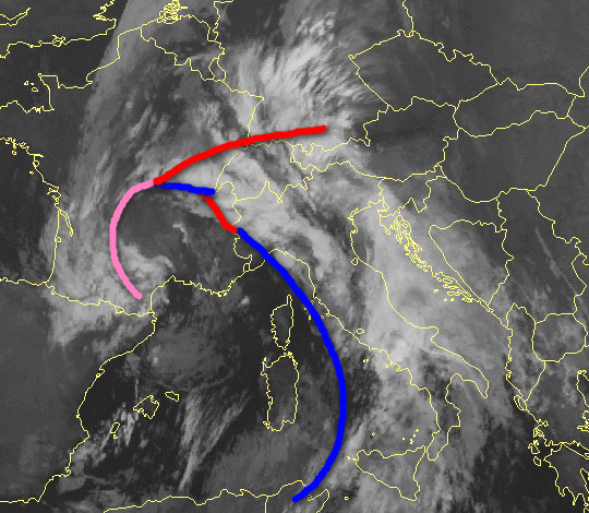 Ecco la perturbazione che si staglia con il suo fronte freddo sui bacini occidentali italiani. Si muoverà verso levante nelle prossime ore, liberando in parte il settore di nord-ovest e temporaneamente le aree tirreniche. Il perno della depressione, attualmente ubicata sul Golfo del Leone, nei prossimi due giorni si sposterà verso sud-est e si andrà ad annidare sulle regioni meridionali, dove avremo maltempo anche intenso nella giornata di domenica 20 ottobre.