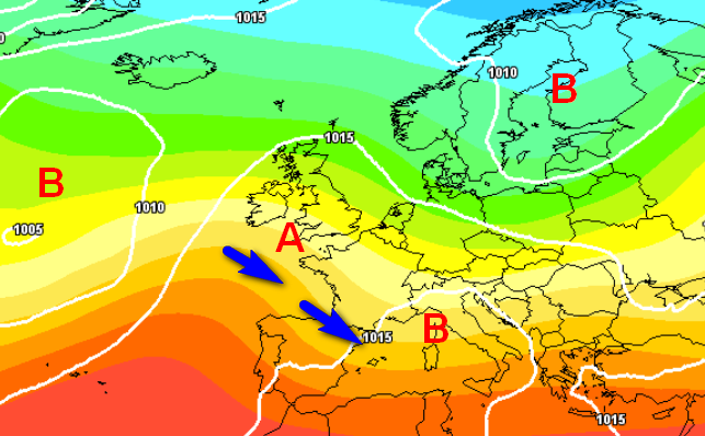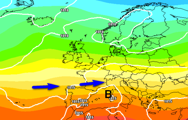 Depressione incastonata al centro-nord della nostra Penisola e condizioni di maltempo in loco. Da notare come l’alta pressione proverà a fare una migrazione verso le Isole Britanniche, ma verrà spazzata via quasi immediatamente dal flusso occidentale.