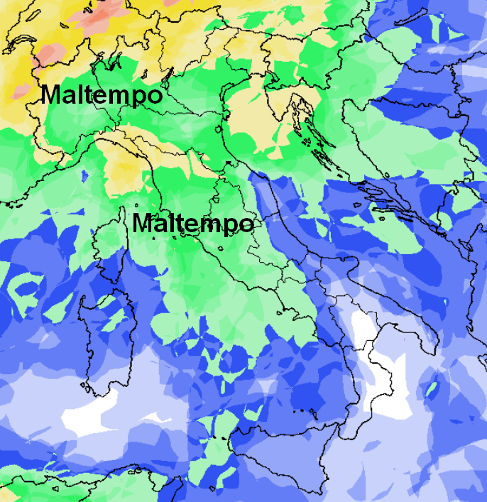 Non si notano cambiamenti significativi rispetto alla mappa sinottica precedente. Regime complessivamente depressionario sull’Italia ed elevato rischio di MALTEMPO soprattutto sul settore centro-settentrionale italico, in un contesto termico sempre abbastanza mite.