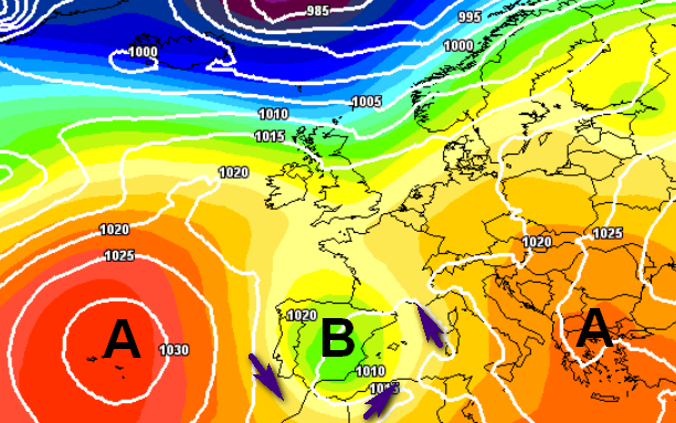 Una saccatura proverà ad avvicinarsi all’Italia tra venerdì 25 e il fine settimana 26-27 ottobre ma non avrà la forza di sfondare in maniera netta, a causa dell’opposizione dell’anticiclone, che la costringerà ad evolvere in un vortice chiuso all’altezza dell’Iberia.