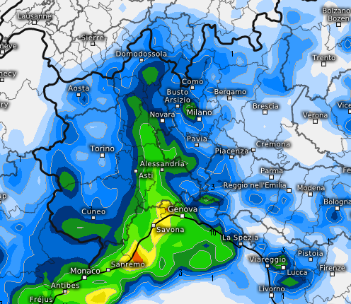In questo caso le precipitazioni si collocherebbero più ad ovest, interessando prevalentemente la Liguria centro orientale e con una “strisciata” il Piemonte orientale, ma senza avere la forza di arrivare nemmeno all’Ossola, se non per una manciata di mm.