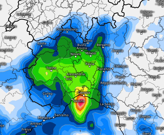 Si notano piogge moderate tra Piemonte e Lombardia occidentale e un picco, a sfondo temporalesco, sulla Liguria centrale, a ridosso di Genova. Si tratterebbe di un bilancio assai meno preoccupante di quello espresso nei giorni scorsi. Vediamo allora ECMWF: