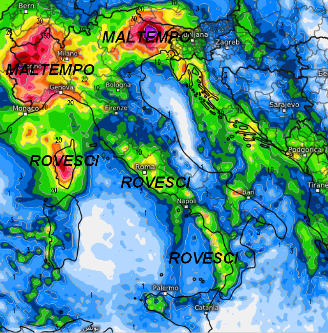 Maltempo anche severo su Piemonte, ovest Lombardia, Val d’Aosta e Liguria con piogge anche a carattere di rovescio, specie nelle aree esposte a stau orografico da sud-est. Maltempo anche su Alto Veneto, Trentino e Friuli. Rovesci sparsi lungo tutto il Tirreno fino alla Campania e la Calabria occidentale. Rovesci anche su Puglia, ovest Sicilia ed ovest Sardegna. Ventoso per venti di Libeccio al centro e al sud, più spenta invece la ventilazione al nord.