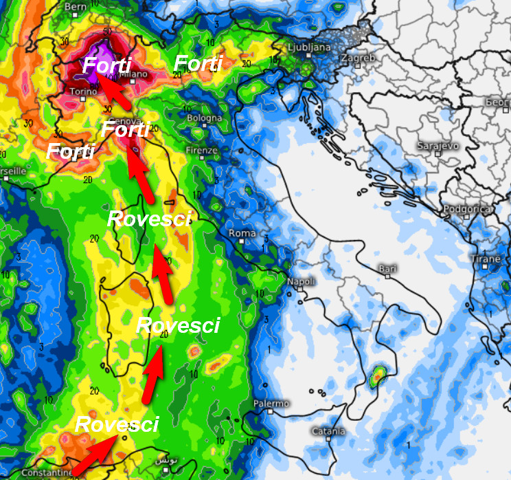 Ecco la traccia dei rovesci che seguiranno la warm conveyor belt sul Tirreno e la Sardegna (frecce rosse). Come si nota dalla mappa, il settore di nord-ovest verrà interessato frontalmente da piogge intense e persistenti, segnatamente su alto Piemonte, bassa Val d’Aosta, alta Lombardia e settore ligure centrale. Rovesci si faranno vedere anche sulla Sardegna, la Toscana, le coste del medio-alto Tirreno fino all’ovest della Sicilia. La perturbazione sarà frenata nel suo incedere verso levante da una zona di alta pressione che si schiererà più ad est.