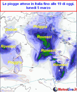 Ecco le piogge attese in Italia nella giornata odierna, lunedi 5 marzo.