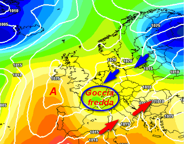 Ecco la sopracitata goccia fredda, cerchiata in blu, che darà effetti in un primo tempo al nord e su parte del centro, per poi spostarsi successivamente anche al sud. Notate l’alta pressione che seguiterà a stare lontana dalla nostra Penisola, con un massimo ubicato sul Vicino Atlantico.