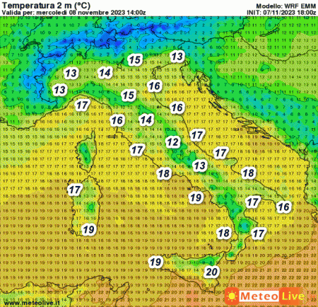 Da segnalare la fine dei valori esageratamente elevati al meridione. Tutta l’Italia avrà temperature attorno alla media o lievemente superiori. I 20° si toccheranno solo in Sicilia.