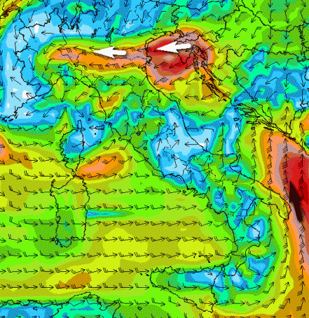 Ecco la sequenza che ci mostra il vento previsto alle 12 di oggi a 10m, il quadro termico a 1500m previsto per la serata odierna e la distribuzione dei fenomeni alle 19 di oggi con la possibile trasformazione della pioggia in neve sulle pianure del nord, laddove esse saranno ancora in atto: