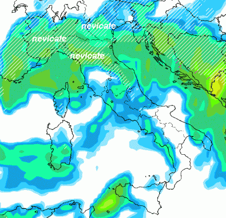 E’ bene ricordare che il modello americano, che alla fine si è rilevato piuttosto attendibile, è comunque il più ottimista nella distribuzione delle precipitazioni. Anche se si attivassero le nevicate previste, si tratterebbe comunque di spolverate o di puri effetti coreografici, le temperature infatti risulterebbero un po’ alte e l’intensità dei fenomeni stessi debole per poter favorire accumuli. SOLO nelle zone soggette a stau orografico come il Piemonte occidentale, la fascia pedemontana emiliana e in parte quella lombarda settentrionale e del Pavese a sud, così come sull’Appennino ligure, potrebbero esserci accumuli più o meno rilevanti.