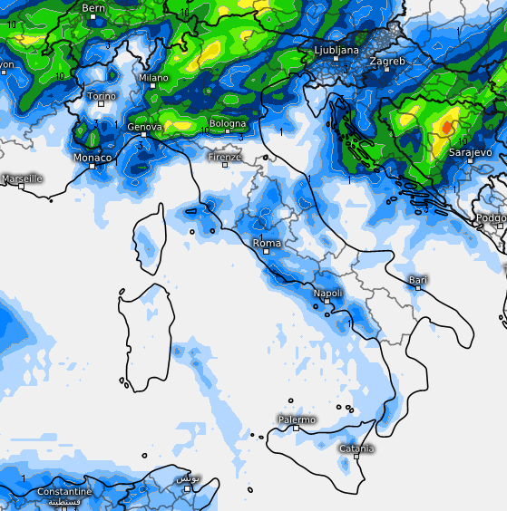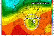 I rovesci si dirigeranno poi verso le Venezie e l’Emilia-Romagna e dietro ad essi le correnti vireranno a nord-ovest, veicolando l’aria fresca di origine artica e di conseguenza innescando il calo termico e altri rovesci a spasso per la dorsale appenninica del centro e poi del sud:
