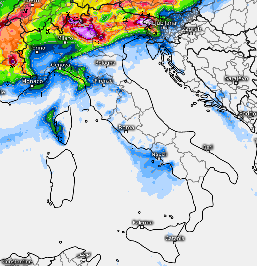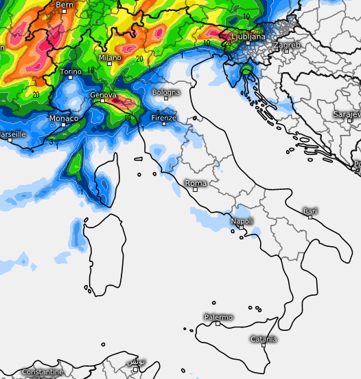 I fenomeni più intensi sono comunque attesi tra il pomeriggio di giovedì 26 e la giornata di venerdì 27 tra Levante Ligure e fascia alpina e prealpina. La corrente che trasporterà la perturbazione infatti assumerà una componente da WSW e dunque molto laminare, quindi investirà il settentrione in modo irregolare, cioè coinvolgerà prettamente le zone di montagna e le alte pianure, molto meno le medio-basse pianure, tranne quella friulana, lasciando ad esempio sottovento il basso Piemonte. Molto abbondanti gli accumuli attesi sull’alta Lombardia, come già segnalato in questo articolo: