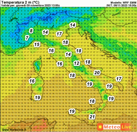 Da segnalare una marcata diminuzione delle temperature sul nord-ovest dove nell’arco della giornata non si supereranno i 10°. Valori abbastanza miti invece altrove ed attorno alla media del periodo. Segnaliamo 21° sulla Sicilia orientale e 20° nel Foggiano.