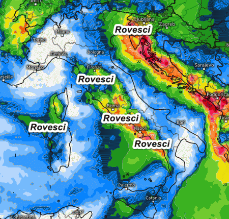 Al nord veloce miglioramento a parte gli ultimi rovesci al nord-est in attenuazione. Rovesci e temporali invece lungo tutto il versante tirrenico e le aree interne, nonchè sulla Sardegna occidentale, il tutto accompagnato da una ventilazione in rotazione ad ovest. Asciutto invece il versante adriatico che si troverà sottovento al flusso occidentale. Temperature in aumento al nord, in calo sulle altre regioni. Ventoso e mari molto mossi.