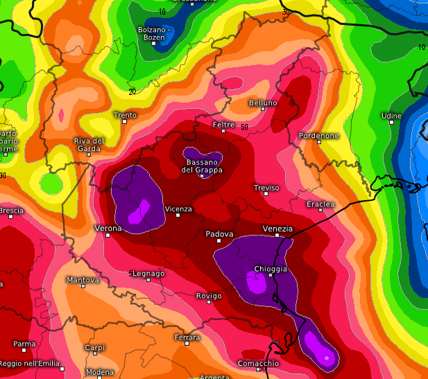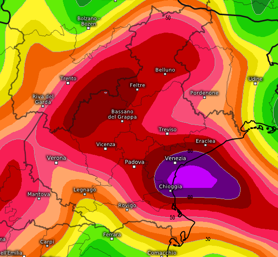 Pioverà molto anche in Emilia-Romagna, ma lo stato di attenzione riguarderà soprattutto il Veneto secondo le emissioni dei modelli matematici. Il modello che segue segnala analogamente una situazione di pioggia decisamente copiosa (in viola) sul tratto di costa compreso tra Venezia e Chioggia, così come le nevicate generose nell’alto Vicentino e nel Feltrino.