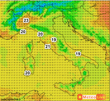 Temperature in aumento al nord-ovest con punte di 23° sulla Pianura Piemontese. 20-21° anche sul medio Tirreno nonchè sulla Sardegna meridionale, per il resto temperature più fresche.