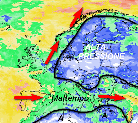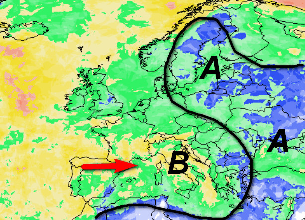 L’alta pressione, rilevabile sulla mappa dalla vasta zona con probabilità di pioggia bassa o nulla, interesserà i settori orientali del Continente. Da ovest si farà strada il flusso atlantico che elargirà piogge su molte regioni italiane oltre ovviamente a preziose nevicate sulle Alpi. In pratica l’alta pressione verrà bucata proprio all’altezza dell’Italia, mentre resterà ben salda più a nord. A tutto ciò si aggiungerà un calo della temperatura specie al nord e al centro.