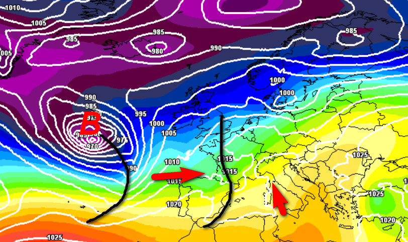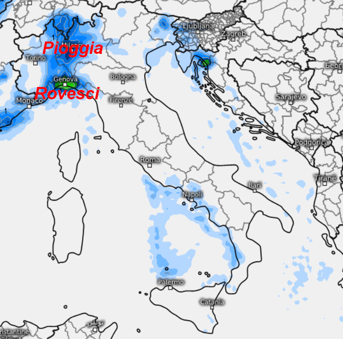 Si nota la percussione atlantica che avverrà sull’Europa occidentale tramite due sistemi perturbati che si avvicineranno in rapida sequenza. La presenza di una relativa zona di alta pressione più ad est rallenterà un po’ la marcia delle perturbazioni con i fenomeni piovosi che potrebbero persistere sulle regioni settentrionali, colpendo con piogge MOLTO abbondanti soprattutto la Liguria e l’alta Toscana sia nei giorni precedenti che in quelli successivi e interessando molto meno gli altri settori italici.